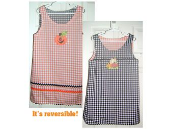 Dress your little princess in this pull-on reversible dress or jumper with custom embroidery on each side. The orange gingham side has a Halloween motif that reverses to a black gingham side with a harvest design. Child's size 5.