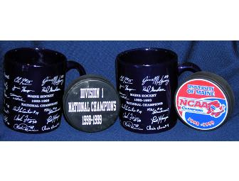 This commemorative set includes 2 coffee mugs with signatures of the 1992-93 national champions and 2 pucks from the 1998-99 championship.