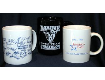 Set of 3 mugs celebrates the 1996-97 Black Bear hockey team with team signatures, the 1998-99 Men's Basketball team listing the seniors and the Swim Team Triathlon.