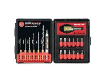 This 21 piece set includes 1/4-in connector, 6 hex shank drill bits, 1 ea 1/16, 5/64, 3/32, 7/64, 1/8, 3/16-in, compact screw guide, 13 assorted 1-in insert bits, plus case. Multi-purpose for wood, metal and plastic.