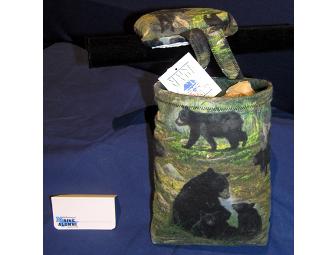 Multi-use bag makes a great trash bag, remote control holder, knitting bag and more. Attached non-slip weight keeps bag in place. Made in Maine by one of our Homecoming Craft Fair vendors. Dimensions are 11.5" high x 19" circumferance.