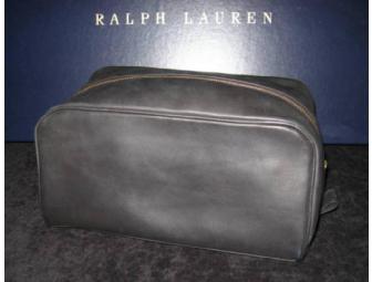 Beautiful Ralph Lauren plush black leather travel case with zipper top. Dimensions 10" wide, 5" tall, and 4 1/2" deep.