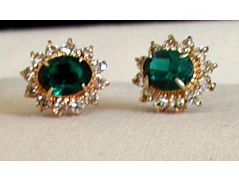 Elegant, tasteful, understated and with brilliant color describes this pair of man-made emerald and diamonds set in a gold plated setting. Harry Winston might have delivered these to you personally and no one would be the wiser. They'll be fun to wear and you can't not feel rich and elegant in them. 1/2" by 7/16" with centered post.
