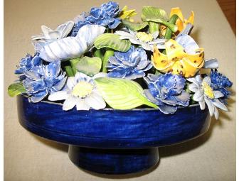 One of a kind, vintage ceramic hand-painted (by famous Fraser Valley ceramicist, Kurf Sutton) flower arrangement. Daylilies, chrysanthemums, in all hues of blue and yellow. Brought to the United States from England in the early 50's. A small chip on one of the flowers.