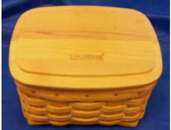 Handwoven Longaberger Basket with wood lid. Includes a set of 3 x 5 Longaberger recipe cards.