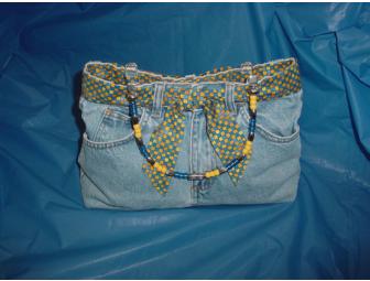 Handmade denim purse, 15" long by 9" tall, is just the kind of arm candy you need this Spring. Lining and belt are blue and gold---Trinity's colors---and has a Velcro closure.