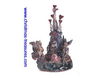 Lovely ceramic music box that holds a T-Lite too! Wind it up and it plays "Someday my prince will come". The princess waits off to one side while the prince (a green frog) approaches mounted on a mighty steed. The castle has hearts on top of its five towers. Seven inches tall and about four inches in diameter. Heather Goldminc, a Canadian artist, created the world famous Blue Sky Clayworks line of collectible ceramics. Heather Goldminc’s Blue Sky Clayworks line of collectible creations are cute, clever, colorful and whimsical. Clayworks please the eye and delight the senses while expressing the joy and wealth of life in simple everyday things.