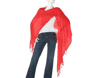 100% acrylic. Can be worn draped over an evening gown or with a t-shirt and jeans. T-shaped design. Approx. 45" long x 53" wide. Hand wash, dry flat.