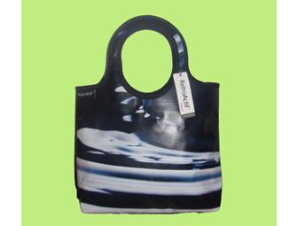 For the Environmentally-Conscious. As featured in the Sun-Sentinel. This tote embodies elements of simplicity and elegance that is guaranteed to compliment any outing. It's curved top and handle give it a feminine and sophisticated style. The IT shape. Eco-friendly tote made from recycled PVC banner materials. Hand-held, interior open pocket and cell phone pocket. Black with grey/white tones.