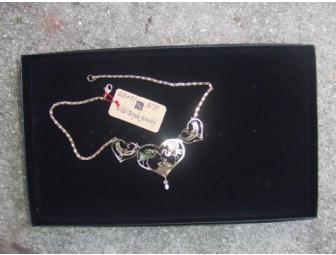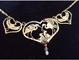 18". 14 kt gold-plated - Three hearts with herons and a dangling freshwater pearl.