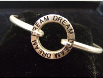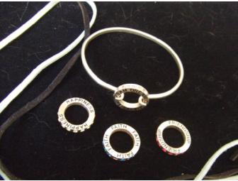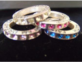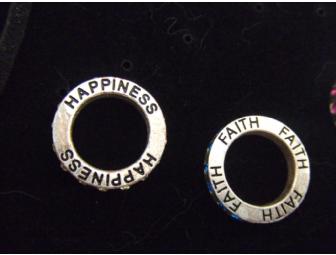 Interchangeable rings with inspirational messages: Dream, Faith, Happiness, Friendship. Can be used with bracelet or on the included black or blue cord. Silver with assorted color crystals.