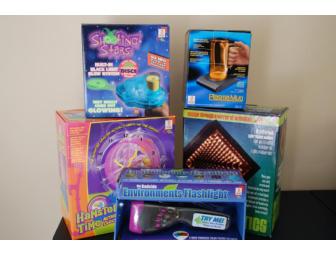 Wonderful collection of kids' light toys including hamster action clock, shooting stars back light glow system, environmental flashlight, plasma mug and more!