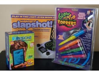 Set includes Glow & Go Toppers, Pin Pressions 3-D image machine, Slapshot tabletop air hockey machine.