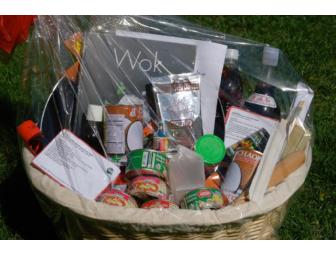 Asian cooking basket filled with culinary delights -- everything you need to make a tasty meal. This basket includes green and red curry paste, coconut milk, Kopi coffee and delicious thai recipes. There is also a Wok cookbook.