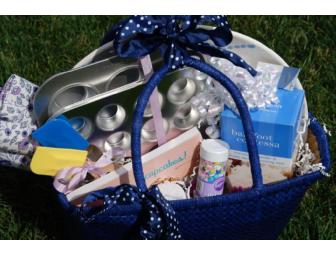 This cupcake basket is filled with goodies -- Barefoot Contessa's coconut cupcake and cream cheese frosting mix, mini-muffin pan and liners, spatula, napkins and sprinkles. Plus, a beautiful platter individually signed by each of Ms. Laham's 3rd graders.