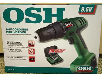 The perfect item for the "tool time" guy: one OSH 9.6 volt cordless drill/driver with 24 piece bit set included. Two year warranty too!