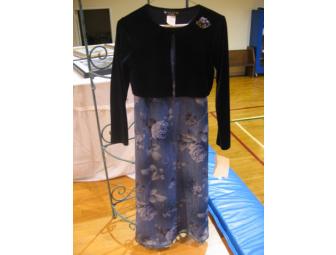 | Biscotti Collection Dress - Tween Size 14. Dark/light blue floral print tea length, sleeveless dress with matching dark blue velvet cropped jacket with accent flower. New. |