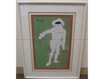 Framed Picasso harlequin print, with white costume and green background. Would look great in your home!