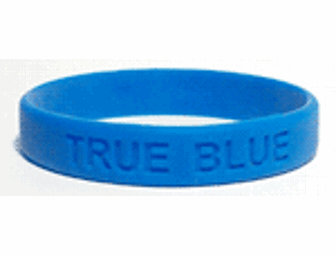 Ten bright blue silicon wristbands debossed with "TRUE BLUE". A TRUE BLUE wristband shows support for a progresive and sane government.