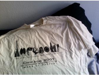 If you missed out on T-shirts displaying Kossack The Gryffin's artwork in 2007, now's your chance to get one of the last 2 remaining shirts. He designed a souvenir shirt with images of all of Chicago's most famous landmarks... except they spell out the word "Impeach."