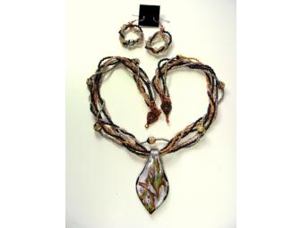 This one-of-a-kind set (actually, all of my pieces are one-of-a-kind) is made of twisted strands of black, pewter-y, silver-y, golden, and coppery seed beads with clear, black. gold and copper round beads. The necklace's 2 1\2 inch long glass pendant is covered by clear glass, is spoon-shaped and hangs about 10 inches from the center of the antiqued copper hook-and-eye clasp. The back side is solid black, and the front features a silvery background with a design in terra cotta, mossy green and glittery copper. The hoop-shaped earrings are about 1 1/4 inch in diameter, and are attached to surgical steel French wires that have clear rubber stoppers to keep them in place.