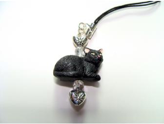 Dress up your cell phone with a new charm. This one has a ceramic black kitty, faceted round German crystal beads, and silver-plated hearts with a sunburst design. Hang the lanyard from your phone's antenna or from the slotted hole that's somewhere in the phone's case.