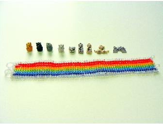 This version of The Rainbow Bracelet is woven of 3mm Czech fire-polished glass beads. It measures just a hair over 7 1/2 inches when closed with the double bead and loop clasps. The lucky winner of this 1 1/2 inch wide cuff may have one of these charms attached at no extra charge. From left to right the charms are: ceramic sitting orange kitty, ceramic sitting black kitty, ceramic sitting grey kitty, ceramic sitting white kitty, silver-plated kitty head, silver-plated sitting kitty, gold-plated sitting kitty, gold-plated doggie, lead-free pewter rainbow with clouds.