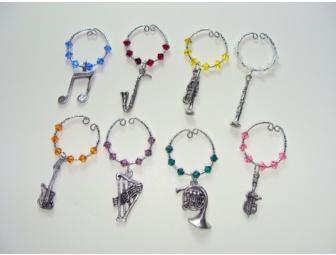 These eight stemware charms have a musical theme. Each has a different instrument instrument or notes and color of Austrian crystal bead, and has silver-lined Delicas all on memory wire.