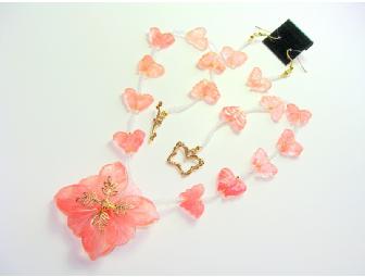 The flower pendant on this necklace, and the butterflies on the necklace and the earrings are made of glass "rose quartz." The 1 1/2 inch pendant hangs about 9 inches from the gold-plated butterfly toggle clasp. The decoration in the middle of the flower is gold-plated, as are the findings. The 1 1/2 inch dangles on the earrings hang from gold-plated French wires. Clear rubber stoppers are included.