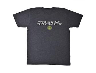 This used to be a plastic bottle! Wait until you feel this t-shirt – you will love the soft and silky feel. Hard to believe, but true – it began as a plastic bottle! Recycled plastic bottles have been melted down and then processed to become a fine yarn which in turn becomes this amazing t shirt. How is that for the ultimate recycling!? We’ve blended it with organic cotton to create the heathered charcoal color. No pesticides, no more plastic - enjoy! 50% RPET polyester/ 50% organic cotton. Vegetable dyed and discharge print screened. Fabric and t-shirt are all made in the USA. A great relaxed fit option for women, too! On the back, the message reads Taking Back Our Country. Available in S,M,L and XL