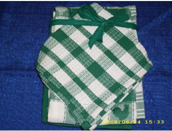 Wonderful country style towel set! Includes 1 Rooster Jacquard Towel, 1 Handkerchief Plaid Towel, 1 Solid Waffle Weave Towel, 1 Plaid Waffle Weave dish Cloth!!! 100% cotton, Designs by Kay Dee Designs, Hope Valley, RI 02832.