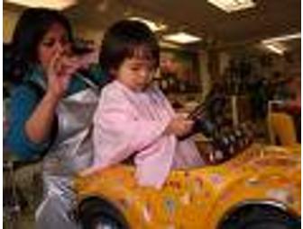 Our hair salons are designed with children and parents in mind. We offer themed station chairs, including a horse, a pig, a police car, a unique motorbike, a fire engine, and an airplane. Children can watch movies such as Finding Nemo™, Thomas the Train™, and The Incredibles™ while we cut their hair; older children can even play Playstation™. There is a play area with Thomas the Train, slides, and toys. Birthday parties are available where we color and spike the children's hair and apply removable tattoos for them.