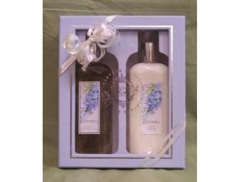 Donated by The Perfumery in Wichita Falls, enjoy this gift box from Crabtree and Evelyn. Gift Box includes one 8.5 oz Wisteria scented Bath and Shower gel and one 8.5 oz. Wisteria scented Body Lotion.