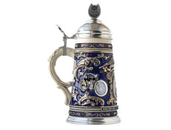 Each stein is enhanced with images of an early model motorcycle and a 105th Anniversary model, soaring eagle, copper-tone filigree, and custom tooled, pewter 105th Anniversary medallion on a traditional cobalt background glaze.