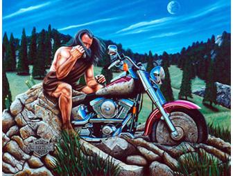 Artist Scott Jacobs created "Evolution" which depicts a scene that is set at Bear Butte Mountain in Sturgis, South Dakota and reveals a 1995 Fat Boy.