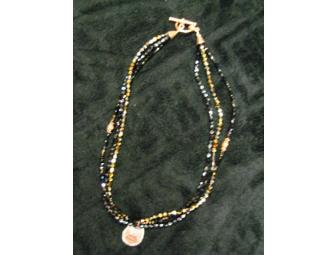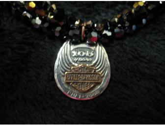 This custom-made Swarovski bronze and black beaded Harley-Davidson 105th Anniversary necklace features three rows of bronze and jet black Swarovski crystal beads, with the Harley-Davidson 105th Anniversary charm in sterling silver.