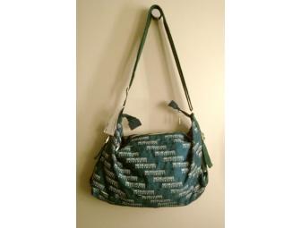 Sewn logo grosgrain ribbon in school colors on contrasting canvas body. Lined with pockets, and an adjustable web strap. Measures 18" x 12".