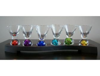 Six shot glasses on a black wood stand. Each glass has a different color base.