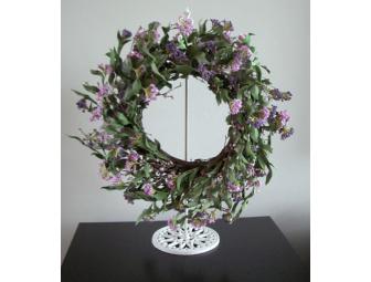 Lavender and berry wreath on metal wreath stand. Wreath approx. 18" diam. Stand Color - Cream