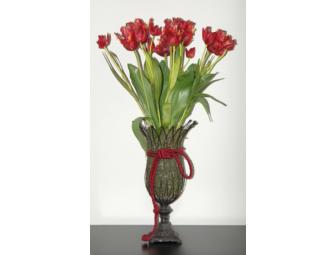 Red Tulips beautifully arranged in a metal vase with green moss. Approx. 33" high.