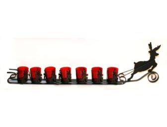 Deer pulling a sleigh of angels holding red votives. Holds (7) candles. Made of metal.