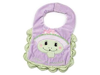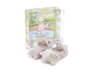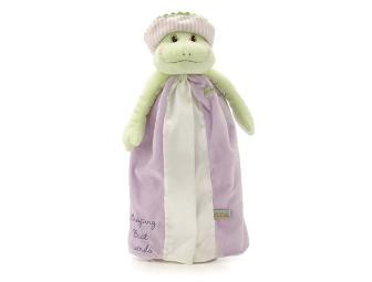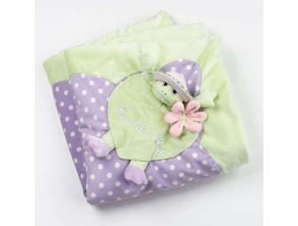 Super soft unique baby girl gift! From Bunnies by the Bay, this blanket is lilac with white spots and green edging on back. She'll be "snug as a bug!" Lily Mae, a precious frog, sleeps in the appliqued heart and is removable for play. 27" by 27". Machine wash, line dry. Package also includes: bib, adorable webbed Maryjane slippers in soft lavendar velour with knit stripe lining. A touch of rick rack and smart green buttons just finish these slippers. Gift boxed. Fits 0-6 months. The package also includes a Lily Mae's Buddy Blanket and a Pocketful of Memories Baby Album.