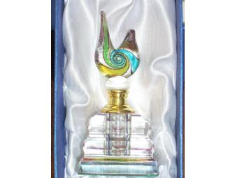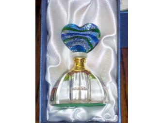 Included in this package is a pair of glass perfume bottles, one topped with a blue heart, the other a bird in swirls of rich color. Simply outstanding on your vanity!