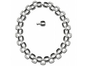 This is a rhodium-plated necklace has classy links alternating in black enamel and clear crystal pavé. The mix of black and crystal makes this necklace sophisticated for any occasion. 14.6" chain, Swarovski Crystal and Rhodium plated.