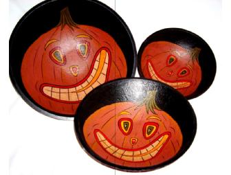 Wacko Jacko wooden Pumpkin Bowls, a set of three with metal stand