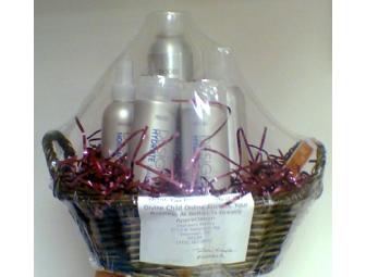 Basket includes Regis Hydrate Shampoo, Hydrate Conditioner, Volumizing Mousse, Leave-In Conditioner and Freeze Hair Spray.
