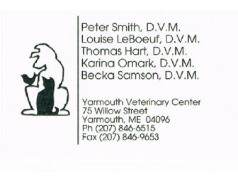 A $50.00 gift certificate to be used at the Yarmouth Veterinary Center for your pet's needs.