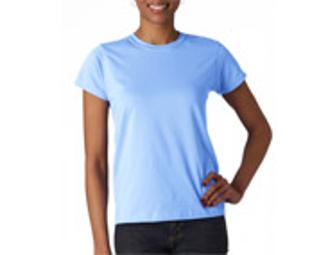 A Gildan Ladies crewneck, shortsleeve T-Shirt in light blue with a blue embroidered Angles Wish logo on the left chest and on the back a slogan "I'm an Angel for Animals."