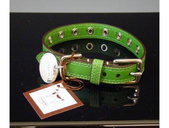 Leather Coach dog collar, bright green. Collar is 11-13". 10 silver grommets and engravable name tag.