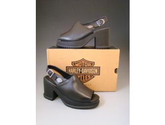 Step into a legend in these black leather sandals featuring a metal bar and shield on the outer strap along with the words "Harley-Davidson" on the strap buckle. Women's size 8.5.